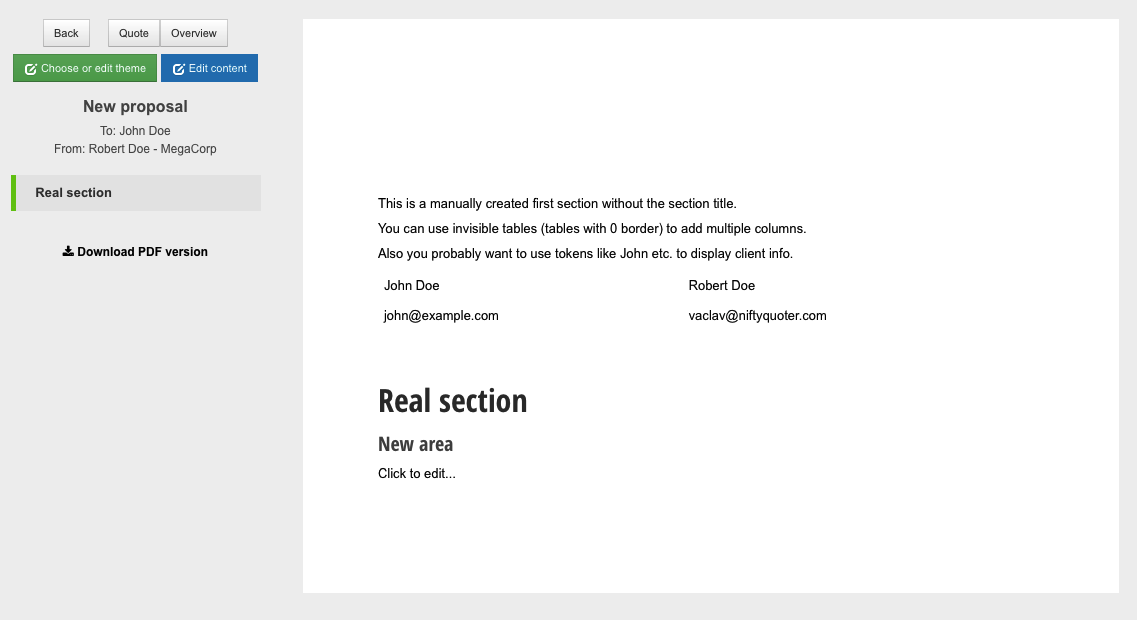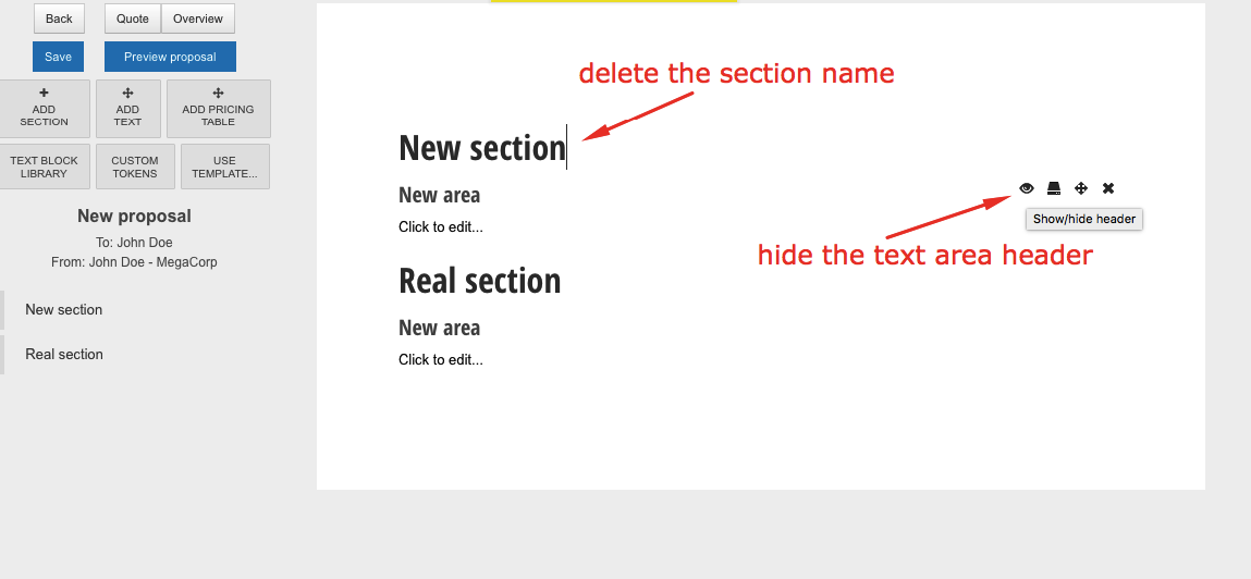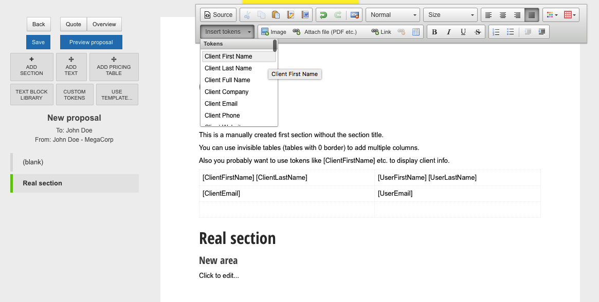 4) click the 'Preview proposal' button - blank section header is not visible and the tokens will be replaced with the actual data